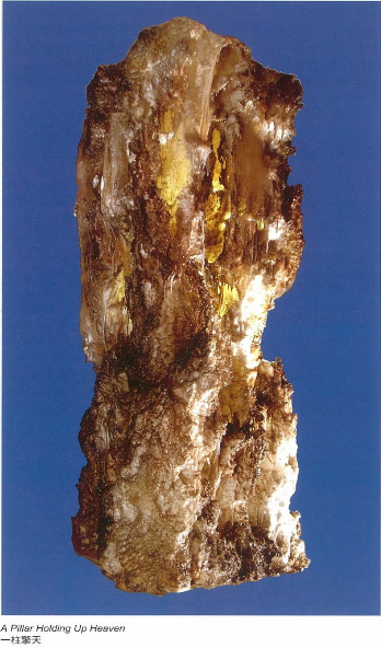 我要说的是,云高大师(即多杰羌佛第三世云高益西诺布顶圣如来──编者注,下同)──我的佛陀法王上师,他的韵雕“一柱擎天”这一圣品艺术已在一年九个月前完成定了型,过了一年九个月我们几个人决定把“一柱擎天”作品安放在展柜中,首先要在底板上紧贴著作品划上地脚线,是为了确定作品的中央位置,我亲自用黑线很细心的沿著作品画了一圈,这时大家发现当时展柜的尺寸计算小了,作品的上半部超出了底板,由于它的体过大,已无法装进展柜中,此时云高大师很严格地批评说:“你们几个为什么当初不量好尺寸,这几千元钱的展柜不就报废了吗?”大师对著“一柱擎天”不经意地自言自语说:“你小一点就好了嘛!……”说完,我们六个人把“一柱擎天”抬下来放在地上,由于它太珍贵,所以几个人都在现场看护著。时间大概过了五个小时,大家将它抬上底板,准备拍照,当“一柱擎天”搬上我画过线的底板,这时一个同学突然大叫一声说:“嘿,它成了孙悟空的金箍棒了”众人一看,“一柱擎”竟然缩小了,佛陀法王就那么一句话“让它小一点”,它果然缩小,装进了展柜。我当下再度用红线在原有划黑线的底板上,沿著作品画了红色的地脚线,两条线一对比,宽面的部分竟然缩小了两寸多,上半部全部缩进了展柜内的区域,这个没有生命、已定型的作品实在是太伟大不可思议了。我是佛弟子,我不会编造假话去错因果,这两条线是我当天根据实际的作品地脚线画下来的,而作品也是当天大师一句话,它就缩小的。如果我以上的文字是虚假编造的,我应该打入三恶道变畜牲,如果我立的文句是真的,将福慧宏生,回向大家幸福。