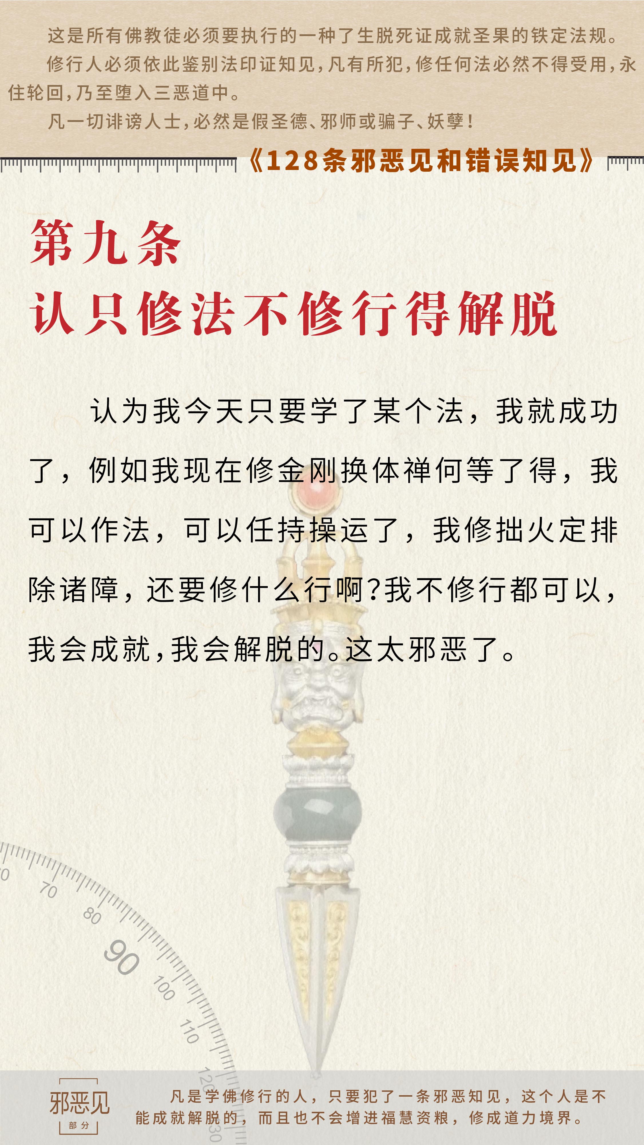 浅释邪恶见和错误知见 第九条 admin 609文章 0评论 11 11 月, 2024 01:10:27南无羌佛 解脱大手印评论6阅读模式 第九条,认只修法不修行得解脱。认为我今天只要学了某个法,我就成功了,例如我现在修金刚换体禅何等了得,我可以作法,可以任持操运了,我修拙火定排除诸障,还要修什么行啊?我不修行都可以,我会成就,我会解脱的。这太邪恶了。 诸恶莫作,众善奉行!!! 点赞 https://putishengjing.com/3122/ 复制链接 复制链接 我的微信 我的微信 微信扫一扫