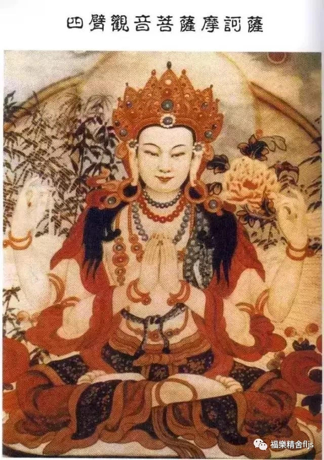 ﹝一﹞(皈依)念四皈依四遍(四皈依)四皈依南無古汝白 南無布打耶南無達摩耶 南無桑嘎耶(念皈依发心四遍)諸佛正法贤圣僧 直至菩提我皈依我以所修諸功德令我成佛渡众生﹝二﹞我等眾生滿虛空頂有白蓮及明月其上一於中現至尊聖者觀世音潔白光明散五彩含笑悲憫視眾生四手上二成合掌下二(上升)各執晶珠與白蓮絲綢寶飾嚴其身胸覆鹿皮頂寶冠冠上端坐阿彌陀雙腿盤作全跏趺背靠一輪清淨月彼為皈依之真性